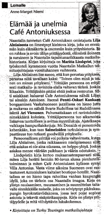 Tällä palstalla kerrottiin, Lilja Ahtiaisesta tehdystä kirjasta. Olen sen nyt lukenut ja kyllä kannatti. Kirja kertoo aina kohteesta ja kirjoittajasta. Kirjat helposti julkisuudessa leimautuvat jonkun uutisen tai paljastuksen tai muun sellaisen lainauksen seurauksena. Niin on käynyt nytkin. Ristiriidat erimielisyydet ja syytökset kaupunkia kohtaan ovat olleet vahvasti esillä. Tähän painotukseen voi olla syynä tositapahtunat, Liljan kokemukset ja kirjan Naantalin Matkailun entisen toimitusjohtajan Maritta Lindqvistin oma näkemys. Siitä kysymyksestä lyhyesti toteaisin, että kaikki ei ole sitä miltä näyttää eikä aina ole niin miltä tuntuu. Riittävän moniseltteisesti tulkittu. Liljan tarina, joka jatkuu edelleenkin vankasti, on vahva kertomus erityisen ja erikoisenkin